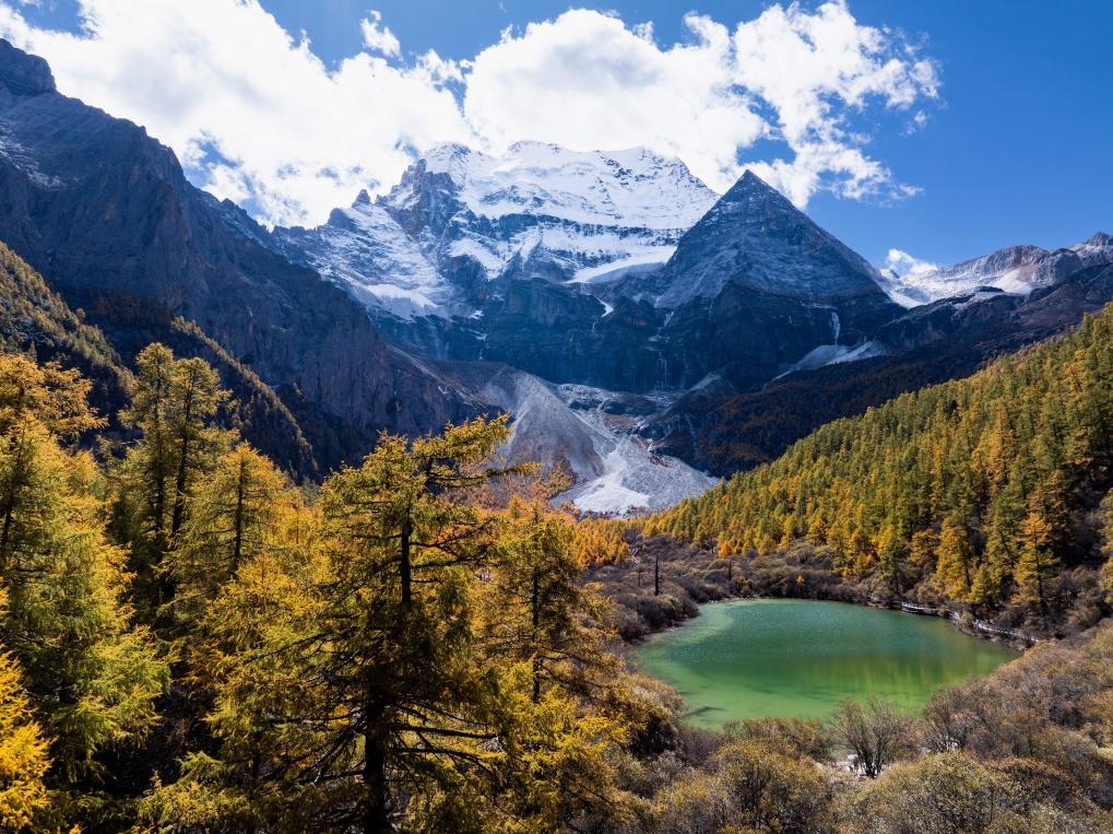 稻城亞丁仙乃日雪山下的湖泊卓瑪拉措掩映在彩林中(2025年10月26日攝,無人機照片)。新華社記者江宏景 攝