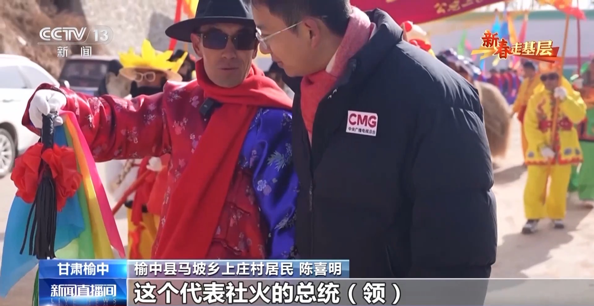 榆中縣馬坡鄉(xiāng)上莊村居民 陳喜明:這個(gè)代表社火的總統(tǒng)領(lǐng),是給我們引場(chǎng)子的,社火就是把大家召集到一起,前段時(shí)間這里遭災(zāi),搞個(gè)社火把大家的精神提一提。
