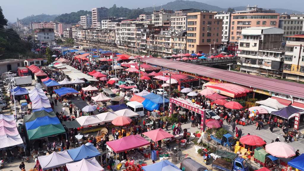 37歲的陳學明帶著8歲的孩子專程驅(qū)車從廈門回鄉(xiāng)“趕圩”。“大集承載著鄉(xiāng)愁。牽著父母衣襟的好奇與期待、熙熙攘攘的人群、鬧哄哄的市集是我最深刻的過年記憶。孩子在城里長大,我想趁著圩日,讓他摸一摸剛摘的青菜、聽一聽鄉(xiāng)音吆喝聲,自己也找找小時候的回憶。”