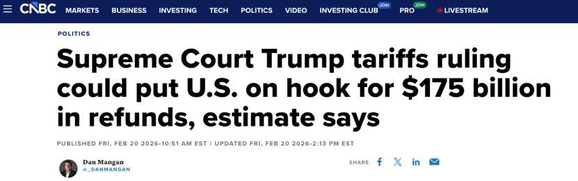 更值得注意的是,從近兩天動作看,白宮的核心優(yōu)先級并不是“盡快把錢退回去”,而是“盡快把關(guān)稅工具續(xù)上”。白宮一方面通過行政令,終止依據(jù)IEEPA加征的額外從價稅,另一方面又迅速依《1974年貿(mào)易法》第一百二十二條祭出為期150天的臨時全球15%關(guān)稅,同時加大利用301條甚至232條等傳統(tǒng)工具,繼續(xù)搭建新的關(guān)稅墻。這套動作釋放的信號十分明確:關(guān)稅杠桿要繼續(xù)用,至于已經(jīng)收來的稅款怎么退、退多少,姑且交給訴訟程序去磨。換句話說,即便法院逼著政府退錢,白宮也在試圖通過新一輪、基于其他法律授權(quán)的關(guān)稅,把現(xiàn)金流盡可能補回來。