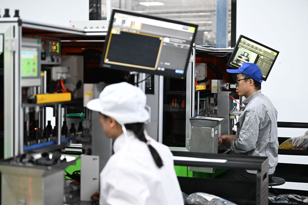 工作人員在天津鵬翎集團(tuán)股份有限公司生產(chǎn)車間操作半自動生產(chǎn)設(shè)備生產(chǎn)汽車膠管接頭。新華社記者 趙子碩 攝