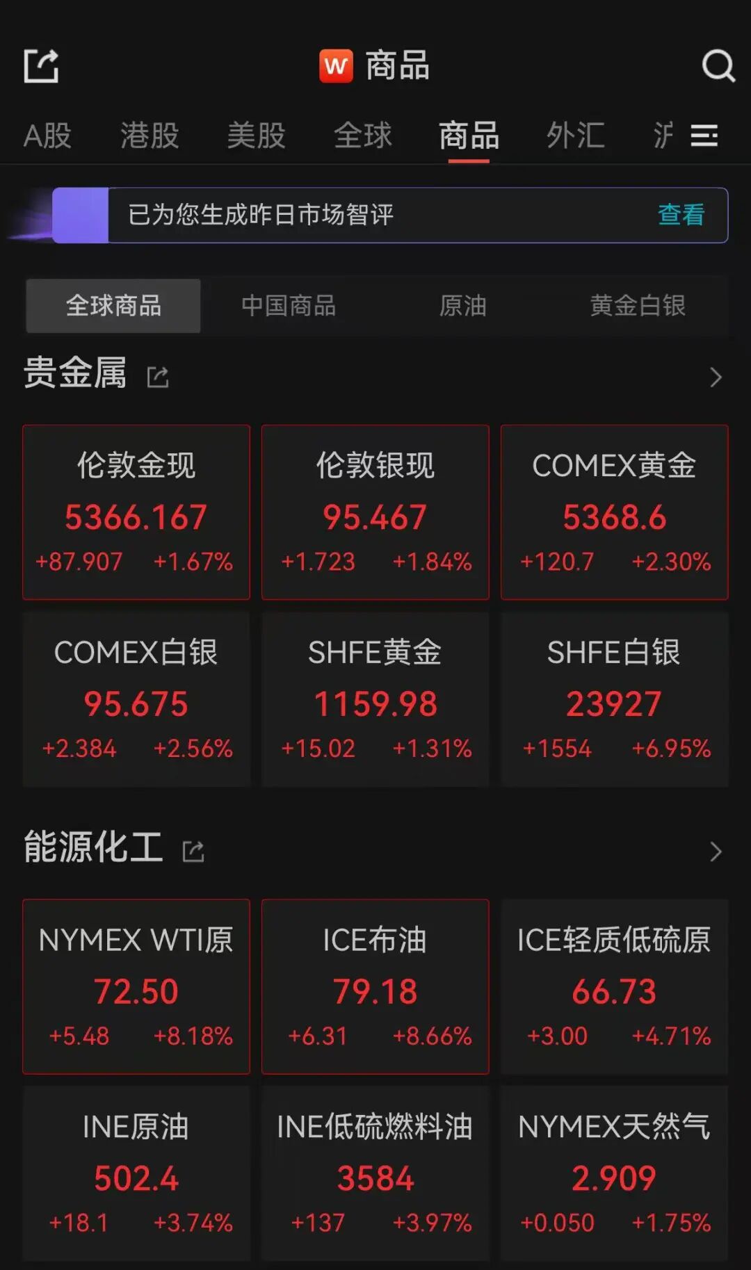 截至發(fā)稿,現(xiàn)貨黃金漲1.67%,盤(pán)中最高觸及5393美元/盎司,布油漲8.66%,美油漲8.18%。