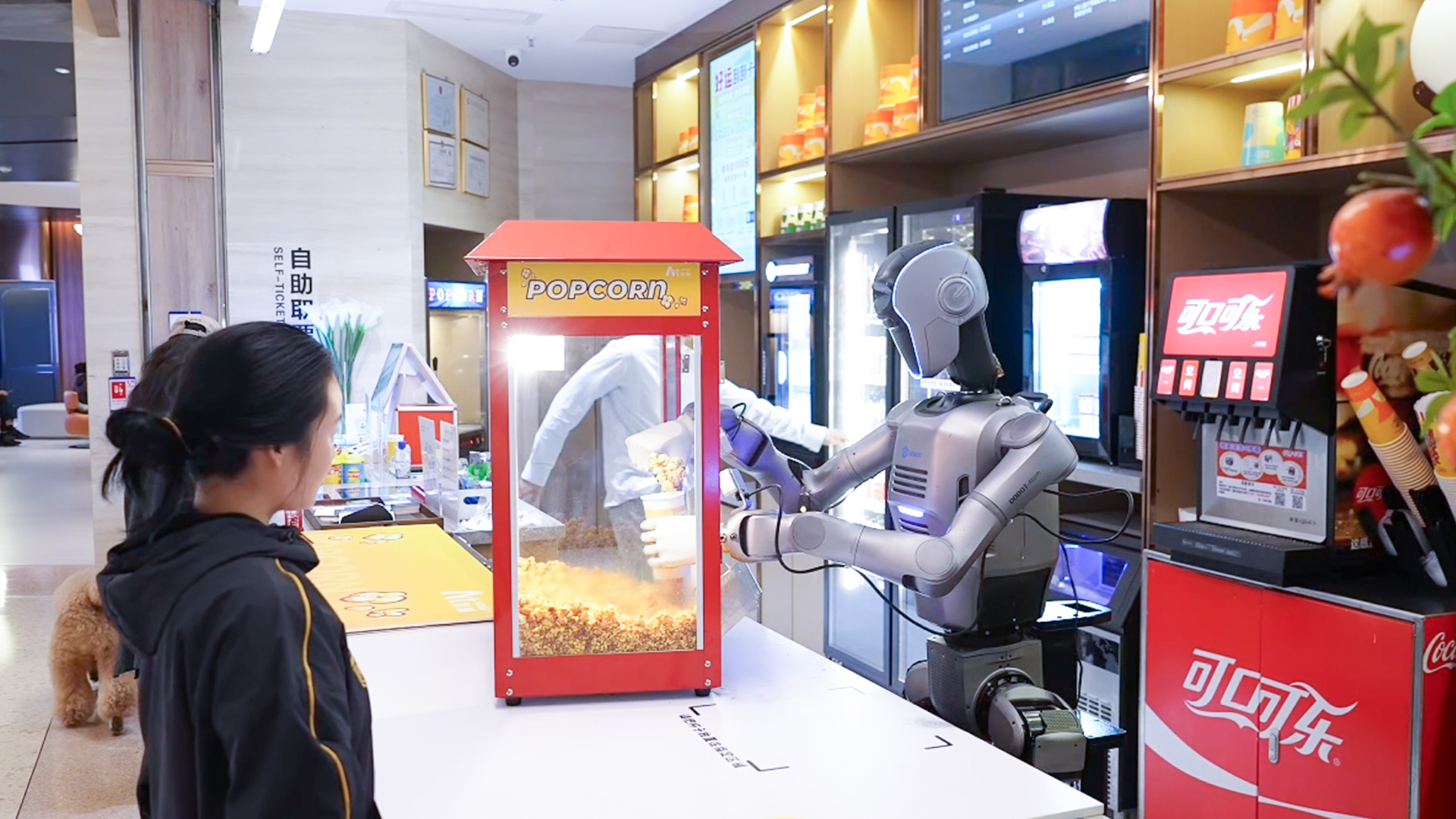 “滴——識(shí)別成功,開(kāi)始制作?!鄙钲贙11影院的爆米花柜臺(tái)前,人形機(jī)器人抓起一只空紙杯,對(duì)準(zhǔn)出料口,金黃的爆米花簌簌落入杯中,不多不少恰好至刻度線。封口、遞送,動(dòng)作雖機(jī)械但流暢。