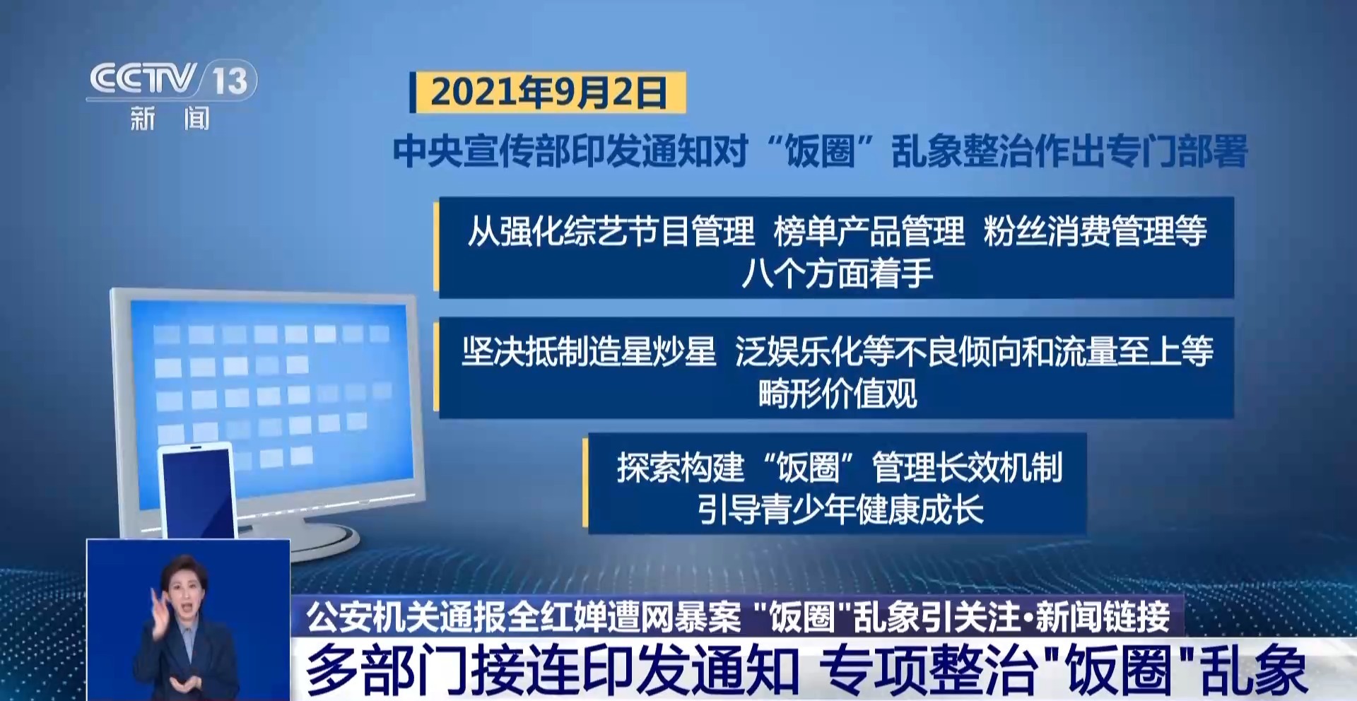 2021年9月2日,中央宣傳部印發(fā)通知對“飯圈”亂象整治作出專門部署。從強化綜藝節(jié)目管理、榜單產(chǎn)品管理、粉絲消費管理等八個方面著手,堅決抵制造星炒星、泛娛樂化等不良傾向和流量至上等畸形價值觀,探索構(gòu)建“飯圈”管理長效機制,引導青少年健康成長。