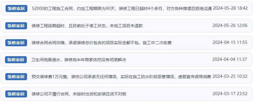 其實(shí),有著同樣遭遇的消費(fèi)者不在少數(shù)。公開報(bào)道顯示,今年以來有多個(gè)家裝機(jī)構(gòu)分公司或經(jīng)銷商跑路,還有個(gè)別不良裝修公司在短時(shí)間內(nèi)聚收大量預(yù)付款后攜款跑路,給消費(fèi)者帶來經(jīng)濟(jì)財(cái)產(chǎn)損失?!叭嗣裢对V”梳理發(fā)現(xiàn),除閉店跑路外,目前平臺(tái)上涉及家裝消費(fèi)類的投訴問題多聚焦于——