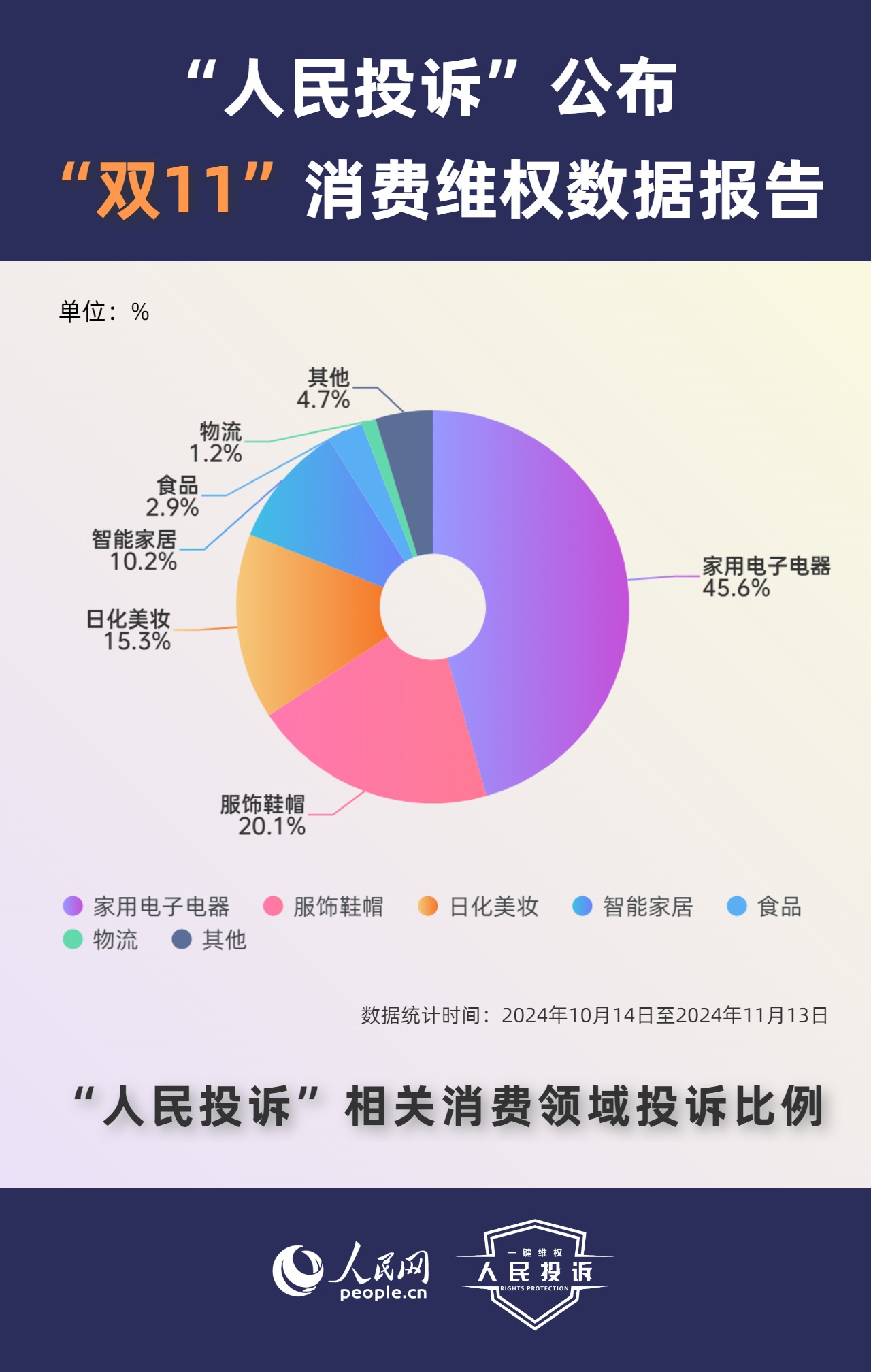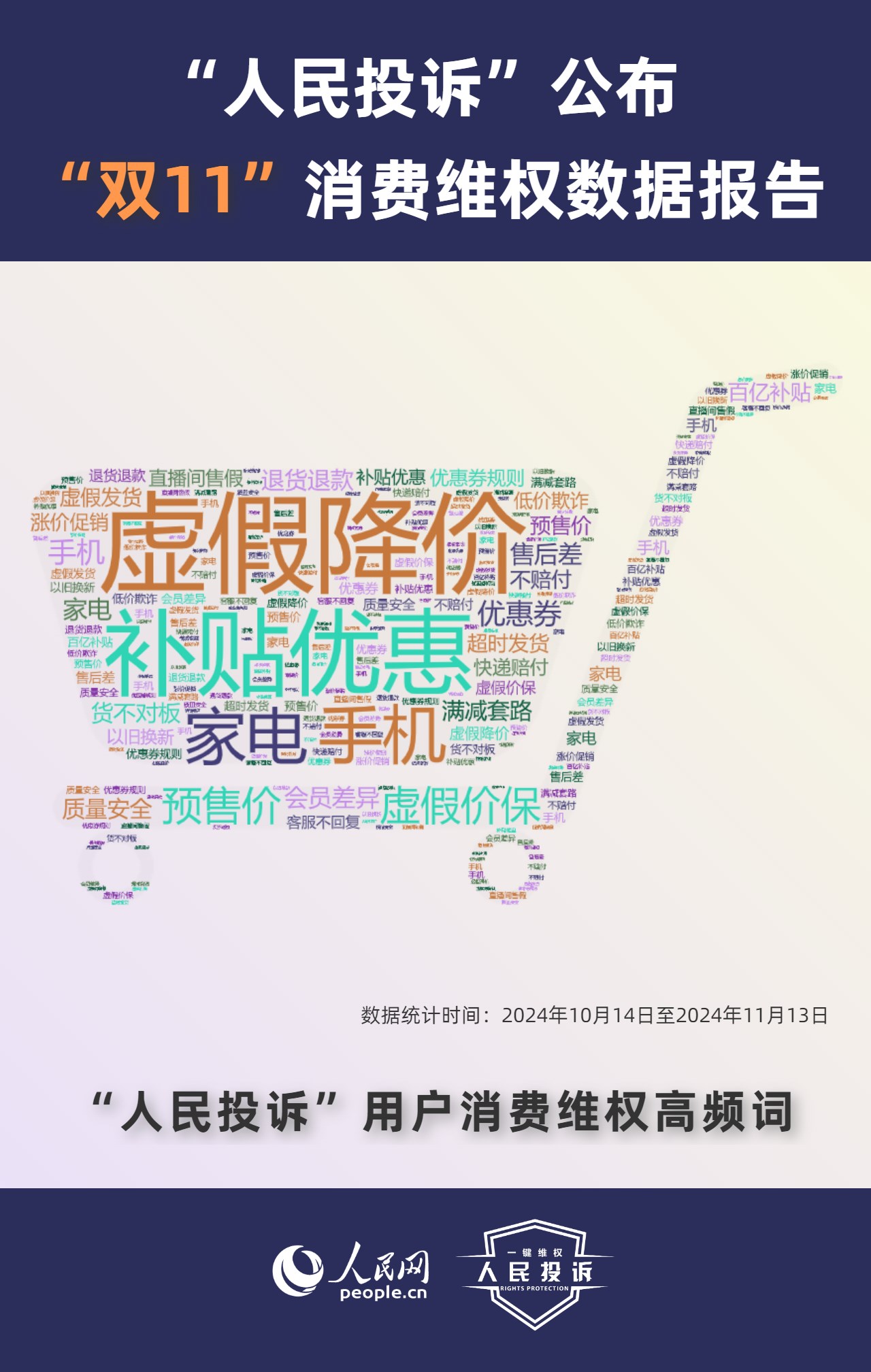那么,今年你的“雙11”購物還遇到了哪些“套路”?據人民網“人民投訴”平臺統(tǒng)計,“雙11”期間平臺共收到17699條(數(shù)據統(tǒng)計從2024年10月14日-11月13日)投訴信息。其中,手機、家電、智能產品、美妝服飾等消費領域維權量大;平臺“國補”“以舊換新”等優(yōu)惠規(guī)則不透明,保價服務藏“貓膩”,直播間虛假“破價”,“百億補貼”商品貨不對板,“高價預售”欺詐等問題反映突出。