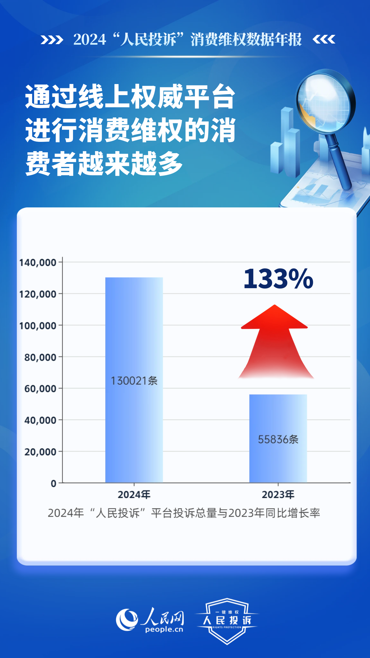 “人民投訴”數(shù)據(jù)顯示,2024年1月1日以來(lái),平臺(tái)共收到投訴130021件,投訴量同比增加133%,有效投訴涉及金額1100余萬(wàn)元。這些數(shù)據(jù)顯示,一年來(lái),越來(lái)越多的消費(fèi)者通過(guò)線(xiàn)上平臺(tái)維權(quán),來(lái)解決消費(fèi)糾紛。