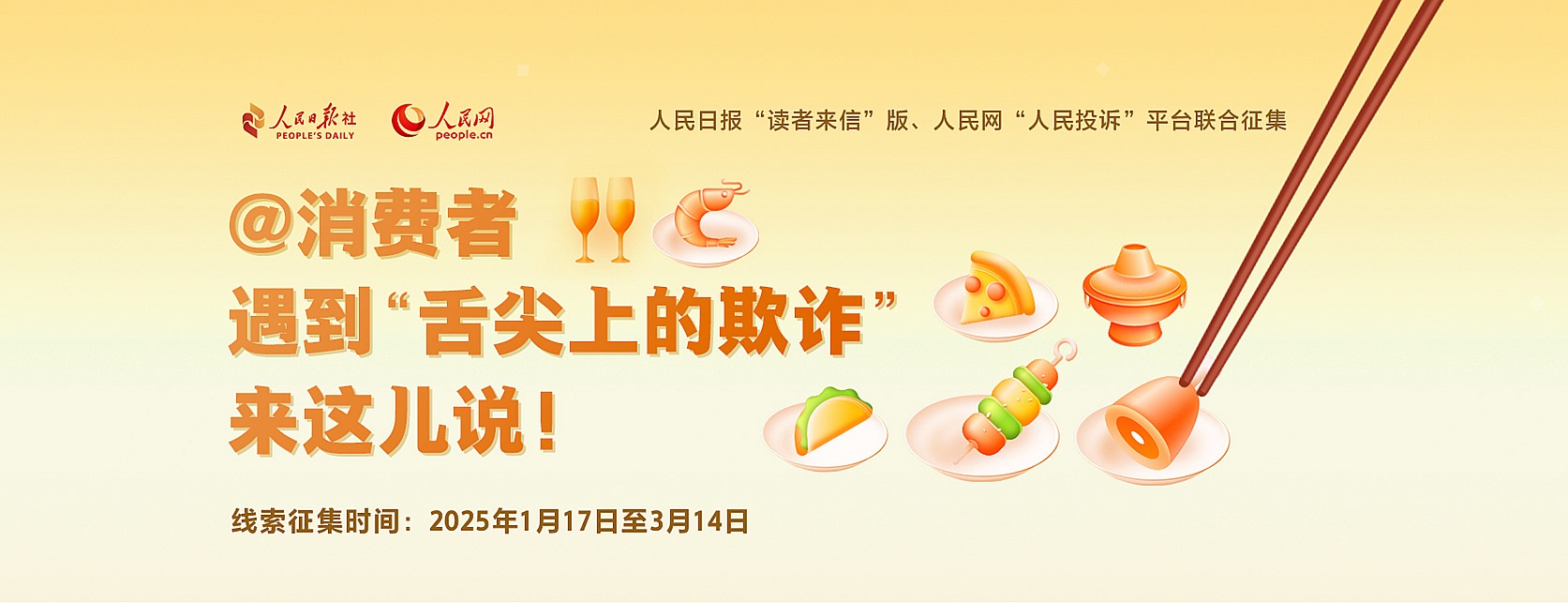 牛肉干里不含牛肉,無糖產(chǎn)品其實(shí)含糖,配料表造假、營養(yǎng)成分表不準(zhǔn)確……你遇到過嗎?“以假亂真”“以次充好”為代表的食品欺詐,嚴(yán)重?fù)p害消費(fèi)者利益,擾亂市場公平競爭秩序。為筑牢食品安全防線,增強(qiáng)消費(fèi)者信心,即日起,人民日報(bào)“讀者來信”版與人民網(wǎng)“人民投訴”平臺聯(lián)合發(fā)起相關(guān)線索征集,歡迎您掃描上方海報(bào)二維碼進(jìn)入征集頁面留言或提供調(diào)查線索至人民日報(bào)“讀者來信”版(郵箱:dzlx@peopledaily.cn 傳真:010-65368495)。線索征集時(shí)間截至2025年3月14日。