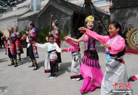 觀看演出時,孩子們與來參加演出的民族藝術(shù)家們共同跳舞。中新社記者 崔楠 攝