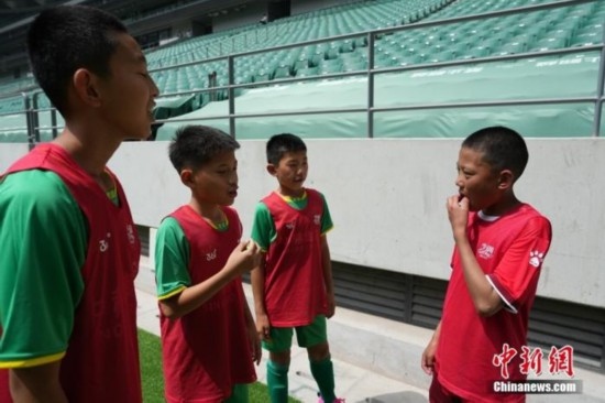 這是孩子們第一次在大型體育場上踢球。教練東周文德說,來北京前,孩子們問他,“C羅踢球的那種球場在哪?”“工體里面的草都是真草嗎?”