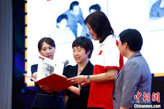 圖為陳經(jīng)綸中學向郎平贈送紀念品。中新社記者 富田 攝