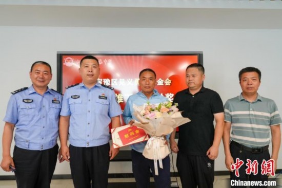 宿遷市公安局宿豫分局和宿豫區(qū)見義勇為基金會(huì)為丁成闖送上見義勇為表彰證書和慰問金。宿豫區(qū)委宣傳部供圖