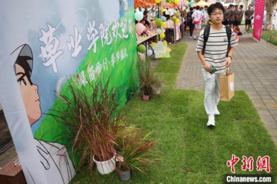 新生從展示的草皮上走過(guò),該草種為南京農(nóng)業(yè)大學(xué)草坪科學(xué)與管理團(tuán)隊(duì)自主培育的藍(lán)光中華結(jié)縷草,葉寬中等,葉色藍(lán)綠,觀賞度高,且耐踐踏,抗旱性強(qiáng),抗病蟲能力強(qiáng)。泱波 攝