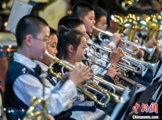 烏魯木齊市第27小學(xué)交響管樂團(tuán)登臺獻(xiàn)藝。中新網(wǎng)記者 劉新 攝