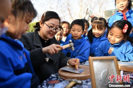 3月11日,河北省級(jí)非物質(zhì)文化遺產(chǎn)項(xiàng)目“郭氏鐵板浮雕”傳承人郭墨涵(黑衣)為學(xué)生展示技藝。中新網(wǎng)記者 翟羽佳 攝