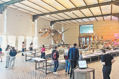 比利時(shí)皇家自然科學(xué)博物館恐龍化石展區(qū)吸引許多觀眾參觀。本報(bào)記者 牛瑞飛攝