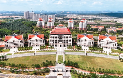 碧空悠悠,湖水如鏡。西洋風(fēng)格搭配閩南傳統(tǒng)燕尾脊屋頂?shù)慕ㄖ溆谑[翠之中,陳嘉庚雕塑在晨光中投下長長的影子,學(xué)生們邁著輕快的步伐趕往教室。廈門大學(xué)馬來西亞分校(簡稱“廈大馬校”)的清晨充滿生機(jī)。如今,這所高等學(xué)府成為中馬高等教育合作的旗艦項(xiàng)目。