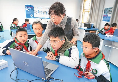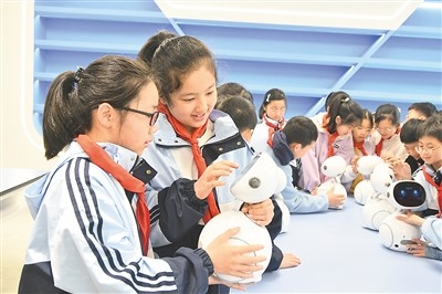 江西省上饒市廣豐區(qū)洋口中心小學(xué)人工智能教室里,學(xué)生們在老師的指導(dǎo)下開展人工智能科普課程。朱文標攝(人民圖片)