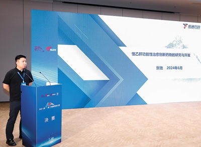 “慢乙肝功能性治愈創(chuàng)新藥物的研究與開發(fā)”項目負責人張弛在二〇二四(第十屆)中國海歸創(chuàng)業(yè)大賽決賽中。主辦方供圖
