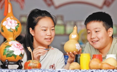 山東省棗莊市龍山路街道非遺作坊,小學(xué)生在學(xué)習(xí)制作彩繪葫蘆。 孫中喆攝(人民視覺(jué))