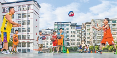 湖南省永州市道縣樹(shù)湘學(xué)校籃球訓(xùn)練營(yíng),孩子們?cè)趨⒓踊@球訓(xùn)練。蔣克青攝(新華社發(fā))