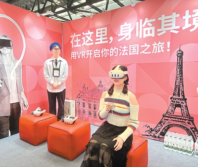 法國(guó)高校展區(qū)設(shè)立了VR體驗(yàn)項(xiàng)目,觀眾戴上眼鏡后可以看到埃菲爾鐵塔等地標(biāo)建筑。