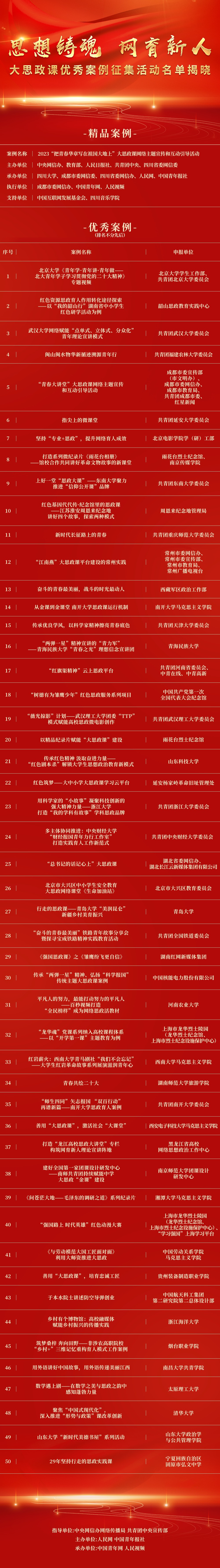 人民網(wǎng)北京2月10日電 (記者王鑫)由中央網(wǎng)信辦網(wǎng)絡(luò)傳播局、共青團(tuán)中央宣傳部指導(dǎo),人民網(wǎng)、中國(guó)青年報(bào)社共同主辦的“思想鑄魂 網(wǎng)育新人”大思政課優(yōu)秀案例征集活動(dòng)評(píng)選今天揭曉結(jié)果,經(jīng)初選、終選以及結(jié)果公示,產(chǎn)生精品案例1件、優(yōu)秀案例50件,名單如下: