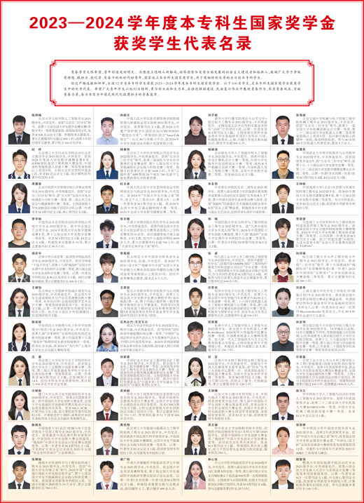 經(jīng)過嚴(yán)格選拔和評審,全國12萬名本??茖W(xué)生榮獲2023—2024學(xué)年度本專科生國家獎學(xué)金。以下100名學(xué)生,是本??粕鷩要剬W(xué)金獲獎學(xué)生中的優(yōu)秀代表。希望廣大青年學(xué)生以他們?yōu)榘駱?,勇?dāng)排頭兵和生力軍,在推進(jìn)強(qiáng)國建設(shè)、民族復(fù)興偉業(yè)中展現(xiàn)青春作為、彰顯青春風(fēng)采、貢獻(xiàn)青春力量,奮力書寫為中國式現(xiàn)代化挺膺擔(dān)當(dāng)?shù)那啻浩隆?/p>