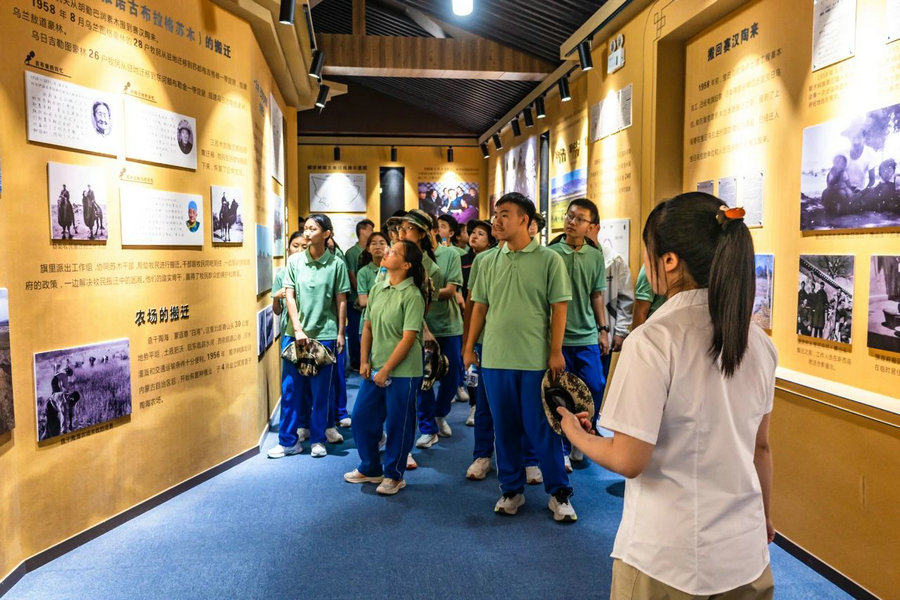 在寶日烏拉黨政機(jī)關(guān)舊址,同學(xué)們聆聽講解,了解“最好牧場為航天”的感人往事, 感受老一輩建設(shè)者們在風(fēng)沙中對祖國的赤誠。烏海市第十中學(xué)胡林濤說:“聽了‘最好牧場為航天’的故事,我真正懂得了什么是舍小家為國家。他們帶著牲畜離開世代生活的牧場,沒有一句抱怨,眼里只有對國家的支持,這種家國情懷太打動人了,以后我也要把這份擔(dān)當(dāng)記在心里,努力成為對國家有用的人。”