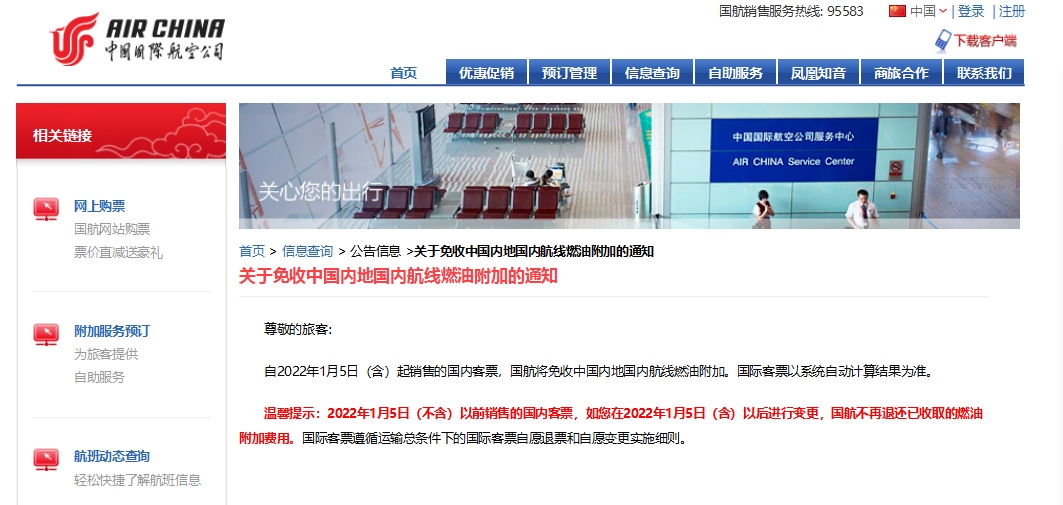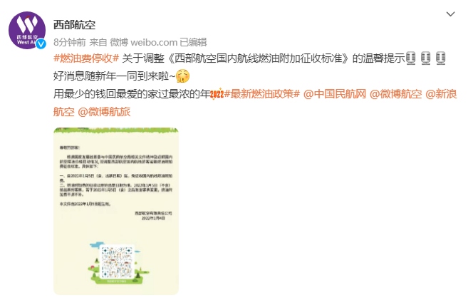 今日,中國國際航空、海南航空、天津航空、西部航空等多家航空公司發(fā)布通知,根據(jù)國家發(fā)展改革委、民航局的相關文件精神,自2022年1月5日零時起(出票日期),取消征收國內(nèi)航線燃油附加費。