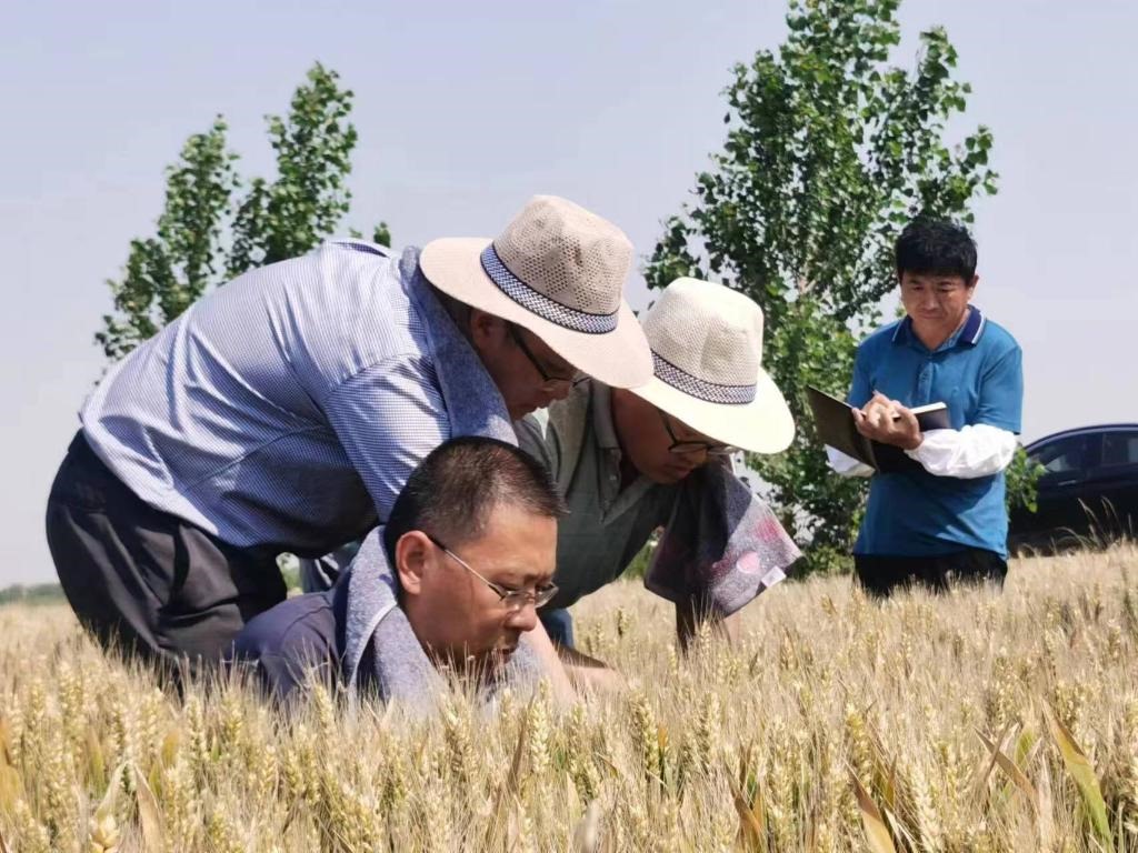 農(nóng)業(yè)專家正在臨邑縣翟家鎮(zhèn)的一處麥田里察看小麥長勢。受訪者供圖。
