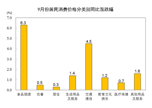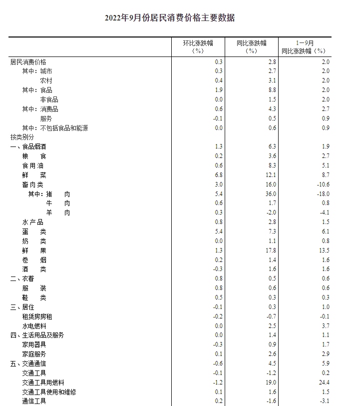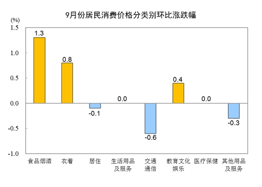 9月份,全國居民消費價格環(huán)比上漲0.3%。其中,城市上漲0.3%,農村上漲0.4%;食品價格上漲1.9%,非食品價格持平;消費品價格上漲0.6%,服務價格下降0.1%。