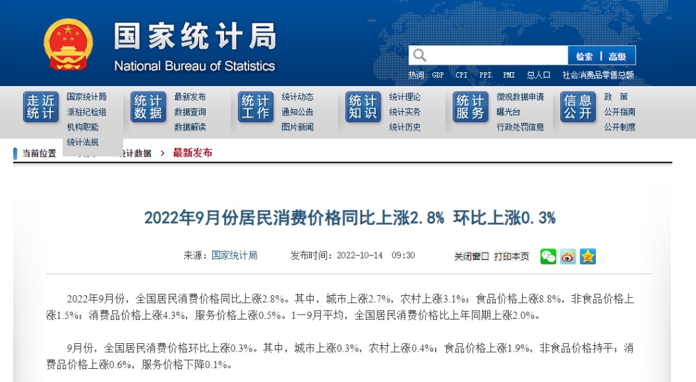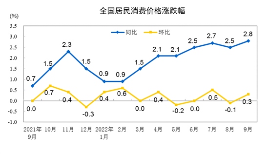 2022年9月份,全國居民消費價格同比上漲2.8%。其中,城市上漲2.7%,農村上漲3.1%;食品價格上漲8.8%,非食品價格上漲1.5%;消費品價格上漲4.3%,服務價格上漲0.5%。1--—9月平均,全國居民消費價格比上年同期上漲2.0%。
