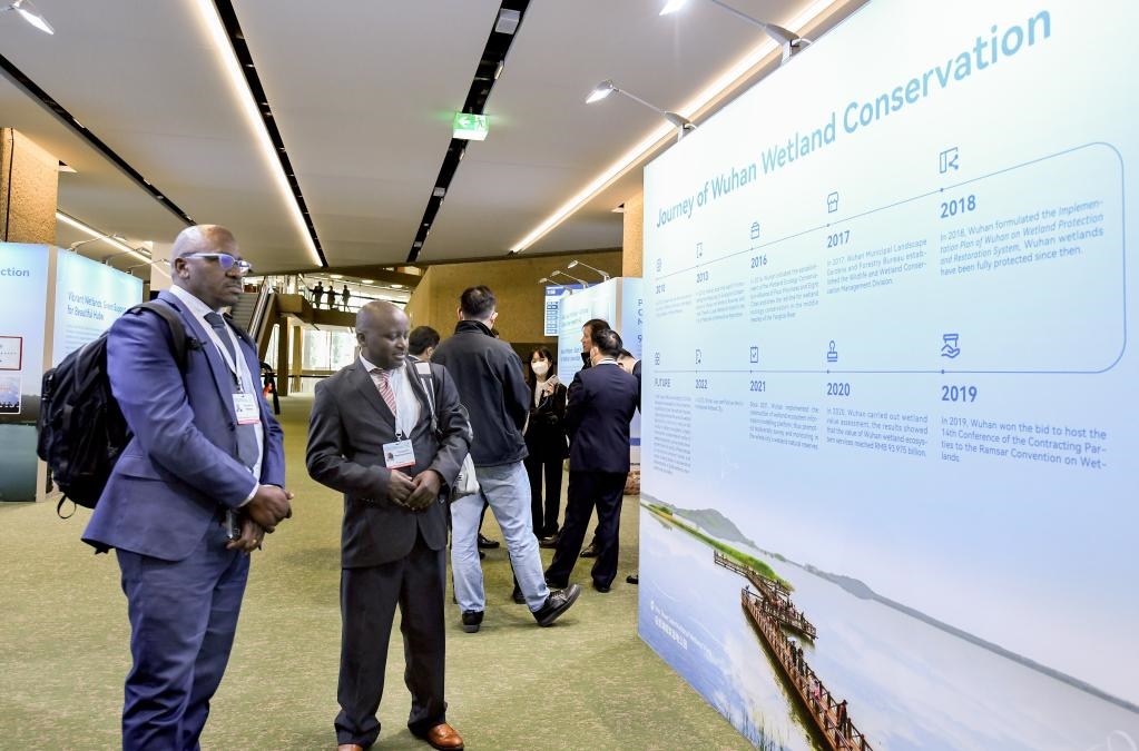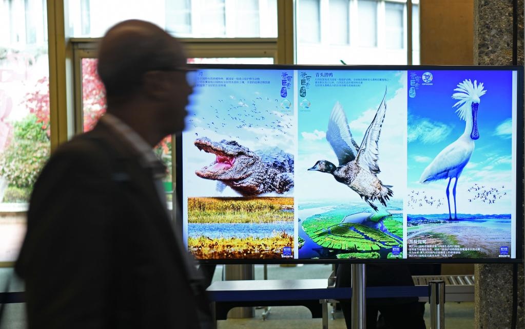 2022年11月5日,在瑞士日內(nèi)瓦,與會(huì)嘉賓在《濕地公約》第十四屆締約方大會(huì)日內(nèi)瓦會(huì)場(chǎng)中國展區(qū)參觀。新華社記者連漪攝