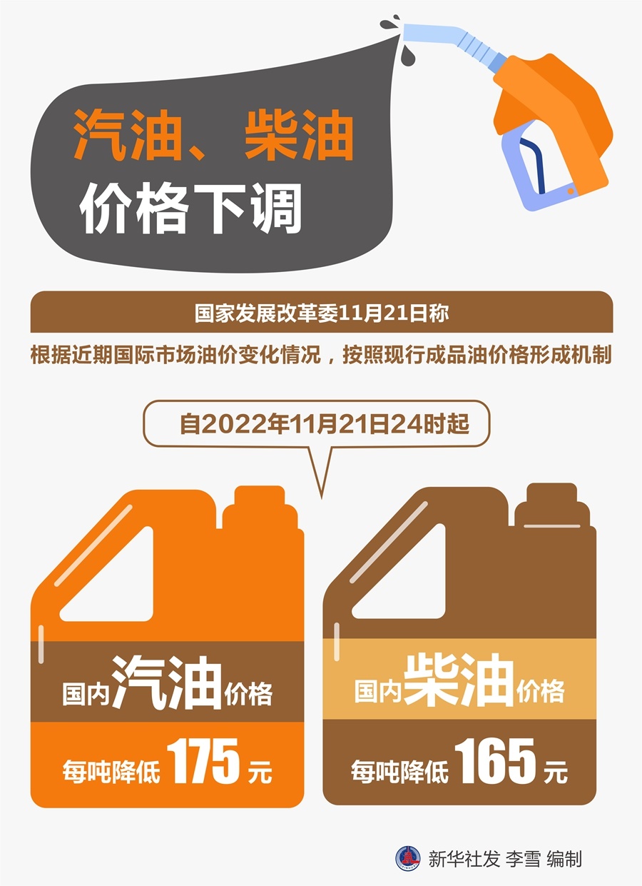 國家發(fā)展改革委21日稱,根據(jù)近期國際市場(chǎng)油價(jià)變化情況,按照現(xiàn)行成品油價(jià)格形成機(jī)制,自2022年11月21日24時(shí)起,國內(nèi)汽油、柴油價(jià)格每噸分別降低175元和165元。
