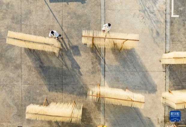 12月12日,在竹塘社區(qū)掛面合作社的掛面車間,工人在將掛面上架晾曬(無(wú)人機(jī)照片)。新華社發(fā)(阮雪楓 攝)