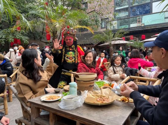 春節(jié)期間,重慶市渝中區(qū)山城巷中,“山城壩壩”茶館的院壩內(nèi)坐滿了客人。人們一邊圍爐煮茶,一邊欣賞臺(tái)上的傳統(tǒng)藝術(shù)表演,川劇變臉演員剎那間切換臉譜,贏得滿堂喝彩。老板舒蓉?zé)崆檎泻糁腿?,將茶水、點(diǎn)心端到桌上,忙得不亦樂乎?!敖衲甏汗?jié)的客流量遠(yuǎn)超預(yù)期,營業(yè)額是去年同期的七八倍。”