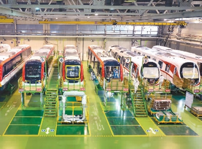 2023年2月14日,湖南省中車株洲電力機車有限公司城軌事業(yè)部總成車間,技術人員在加緊組裝城軌車輛,趕制國內外客戶訂單。李 健攝(人民圖片)