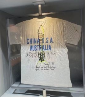 再給大家推薦一個不容錯過的“打卡點”:澳星發(fā)射成功紀念T恤。這件T恤全部都是著名航天老專家們的“親簽”:林宗棠(時任航空航天部部長)、劉紀原(時任航空航天部副部長)、沈辛蓀(時任中國運載火箭研究院院長)、王德臣(時任長二E火箭總設計師)、屠守鍔(時任長二E火箭技術(shù)總顧問)等。在紀念T恤的C位,還有劉竹生院士親筆畫的長征二號E運載火箭(即“長二捆”火箭)的漫畫圖??芍^眾“星”云集,珍貴程度可想而知。