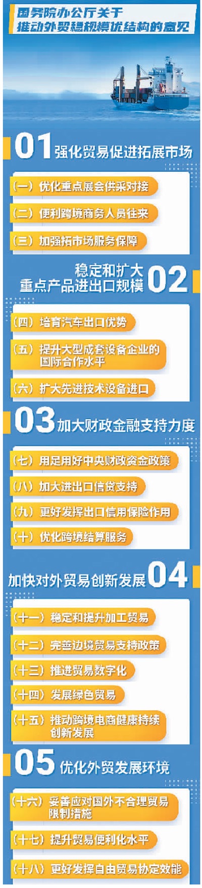 為推動外貿(mào)穩(wěn)規(guī)模優(yōu)結(jié)構(gòu),在前期已出臺多輪政策舉措的基礎(chǔ)上,國務(wù)院辦公廳4月25日對外發(fā)布《關(guān)于推動外貿(mào)穩(wěn)規(guī)模優(yōu)結(jié)構(gòu)的意見》(以下簡稱《意見》),推出新一輪措施。專家認(rèn)為,此次提出的18條具體措施既涉及重點產(chǎn)品,也關(guān)乎市場拓展和貿(mào)易創(chuàng)新,具有很強的針對性和操作性,有助于穩(wěn)住外貿(mào)規(guī)模,并在此基礎(chǔ)上進(jìn)一步優(yōu)化外貿(mào)結(jié)構(gòu),推動實現(xiàn)全年進(jìn)出口促穩(wěn)提質(zhì)目標(biāo)任務(wù)。