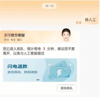 現(xiàn)實中,智能客服的出現(xiàn)的確提供了諸多便利,但當智能客服的標準化應(yīng)答無法解決遇到的具體問題時,更多用戶便轉(zhuǎn)向人工客服。然而,人工客服的接通率較低。有網(wǎng)友反映,即便通過排隊接入人工客服,有時為了提交信息退出聊天窗口后,又需重新排隊進入,而此時,人工客服已換人,之前提出的問題也需要重復表述。