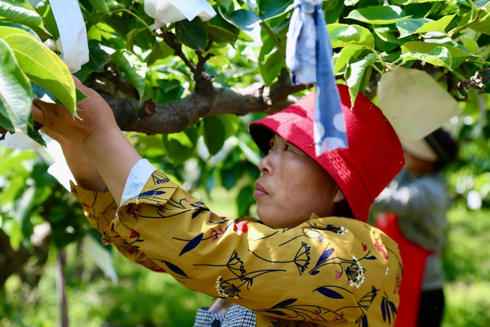 附近村民在梨園里實(shí)現(xiàn)就業(yè)。初夏時(shí)節(jié),村民給剛長出的小梨“穿衣裳”。