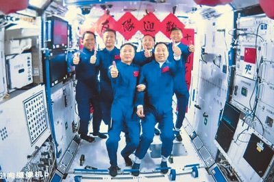 神舟十五號航天員乘組與神舟十六號航天員乘組拍下“全家福”。