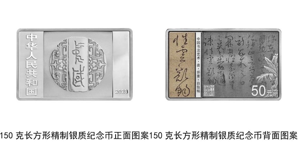 150克長方形銀質(zhì)紀(jì)念幣背面圖案為唐代懷素書《自敘帖》局部文字及“性靈豁暢”字樣與芭蕉、石頭、“中國書法藝術(shù)”篆刻鈐印等組合設(shè)計(jì),并刊“中國書法藝術(shù)·唐·懷素·自敘帖”字樣及面額。