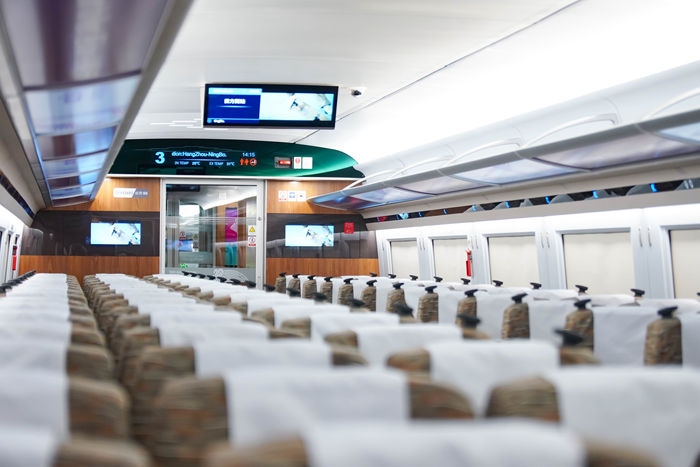 復(fù)興號(hào)亞運(yùn)智能動(dòng)車組列車車廂。上海鐵路局融媒體中心供圖