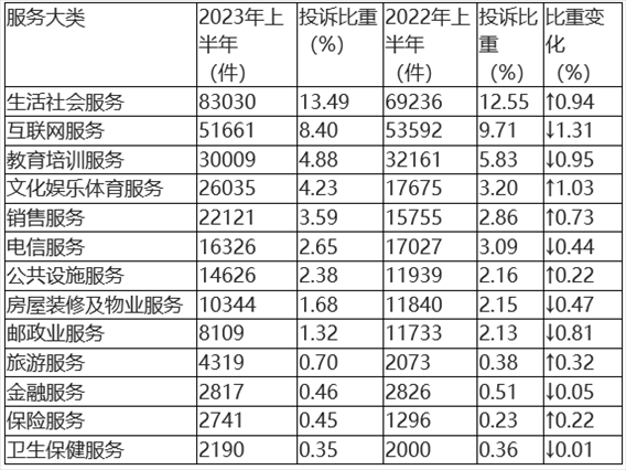 根據(jù)2023年上半年服務(wù)大類投訴數(shù)據(jù)(如圖3、表3所示),生活社會(huì)服務(wù)類、互聯(lián)網(wǎng)服務(wù)類、教育培訓(xùn)服務(wù)類、文化娛樂體育服務(wù)類與銷售服務(wù)類居于服務(wù)類投訴量前五位。與2022年上半年相比,文化娛樂體育服務(wù)類、生活社會(huì)服務(wù)類投訴比重有所上升,互聯(lián)網(wǎng)服務(wù)類、教育培訓(xùn)服務(wù)類投訴比重略有下降。