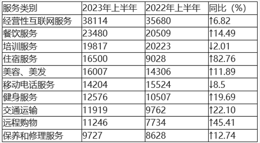在具體服務(wù)投訴中,投訴量居前五位的分別為(如圖5、表5所示)經(jīng)營(yíng)性互聯(lián)網(wǎng)服務(wù)、餐飲服務(wù)、培訓(xùn)服務(wù)、住宿服務(wù)、美容美發(fā)。與2022年上半年相比,住宿服務(wù)、遠(yuǎn)程購物、保養(yǎng)和修理服務(wù)進(jìn)入服務(wù)類投訴前十。其中,住宿服務(wù)、遠(yuǎn)程購物投訴量同比顯著增長(zhǎng),移動(dòng)電話服務(wù)投訴量同比有所下降。