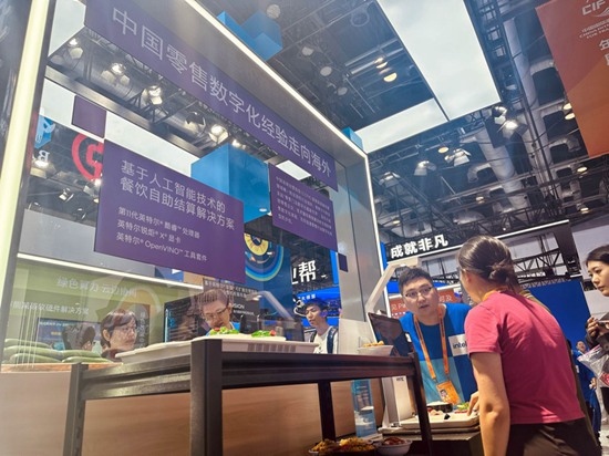 9月2日,觀眾在了解并體驗(yàn)基于人工智能技術(shù)的餐飲自助結(jié)算解決方案。人民網(wǎng)記者 申佳平攝