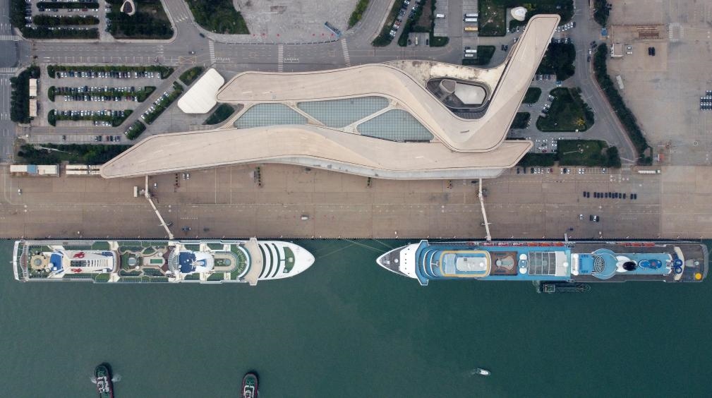 9月27日,“夢(mèng)想”號(hào)郵輪(左)、“地中?!碧?hào)郵輪靠泊在天津國(guó)際郵輪母港準(zhǔn)備啟航(無人機(jī)照片)。新華社記者 趙子碩 攝
