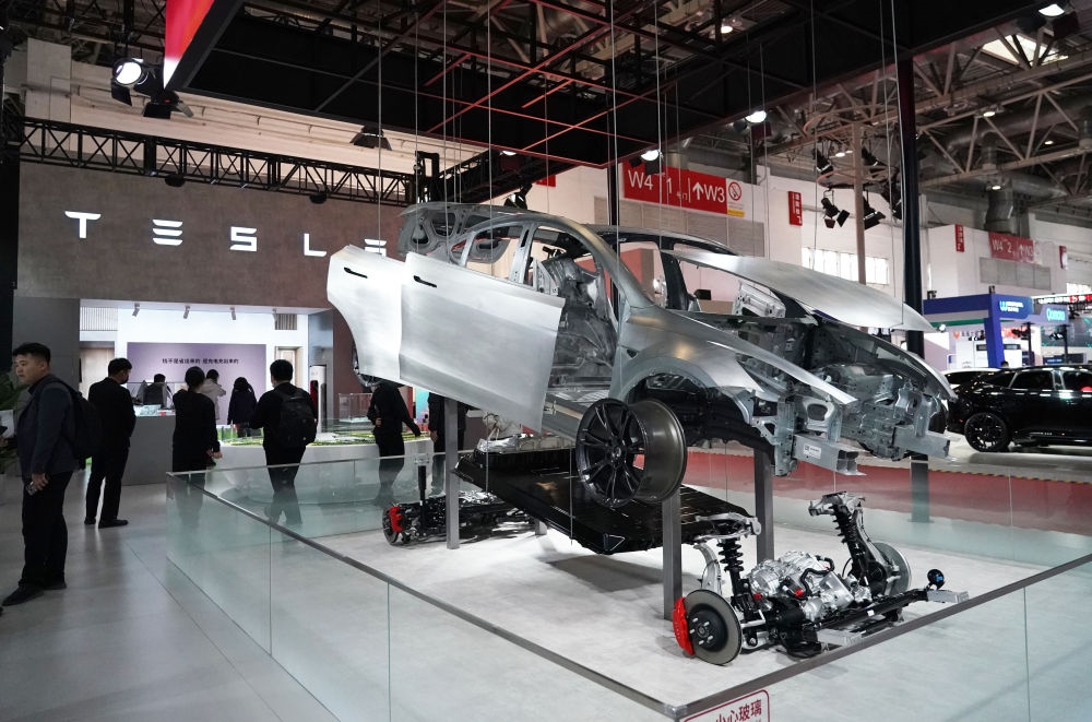 這是在首屆中國國際供應(yīng)鏈促進(jìn)博覽會現(xiàn)場拍攝的特斯拉展位(2023年11月30日攝)。新華社記者 任超 攝